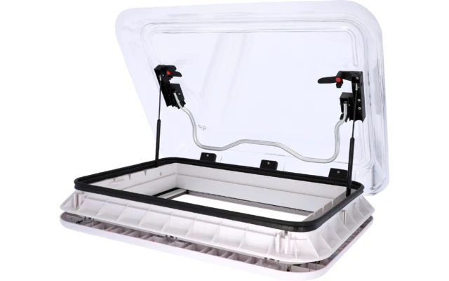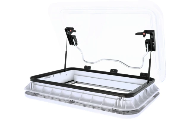 Cofano trasparente. Include una zanzariera a regolazione continua (100% poliestere) e una tenda oscurante (100% policloruro). Ritaglio 70 x 50 cm. Il cofano del tetto può essere montato facilmente grazie a una staffa. Per spessori di tetto compresi tra 28 e 60 mm.