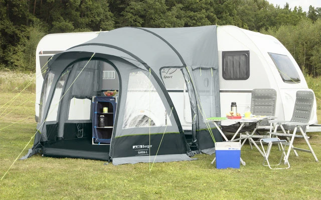Il tendalino per caravan Garda-L assicura un rapido relax e la massima flessibilità nel vostro luogo di vacanza! Grazie ai pali gonfiabili e alla retrazione nel binario delle tubature, è facile e veloce da montare. Il Garda-L offre uno spazio abitativo luminoso e accogliente, in cui è facile stare anche in caso di maltempo. Le grandi finestre panoramiche, che possono anche essere chiuse dall’interno per renderle opache, offrono un’eccellente vista dei dintorni. Il baldacchino nell’ingresso principale vi offre un’ulteriore protezione dalla pioggia. Per una buona ventilazione, troverete delle prese d’aria permanenti sulla parete anteriore, così come delle zanzariere sulla porta d’ingresso e sulle finestre laterali. La tenda parziale ha anche un’ulteriore entrata laterale sul lato destro. L’altezza nella tenda è di 243 cm.